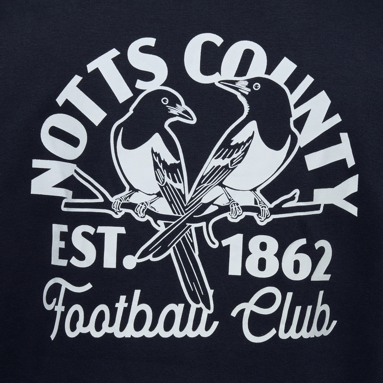 The front displays a small embroidered two-magpies motif, while the back features a bold graphic print with the magpies reading “Notts County Football Club – Est. 1862”. The unique artwork gives a modern edge to a classic club look, celebrating the long-standing heritage of Notts County in a fresh new style.
