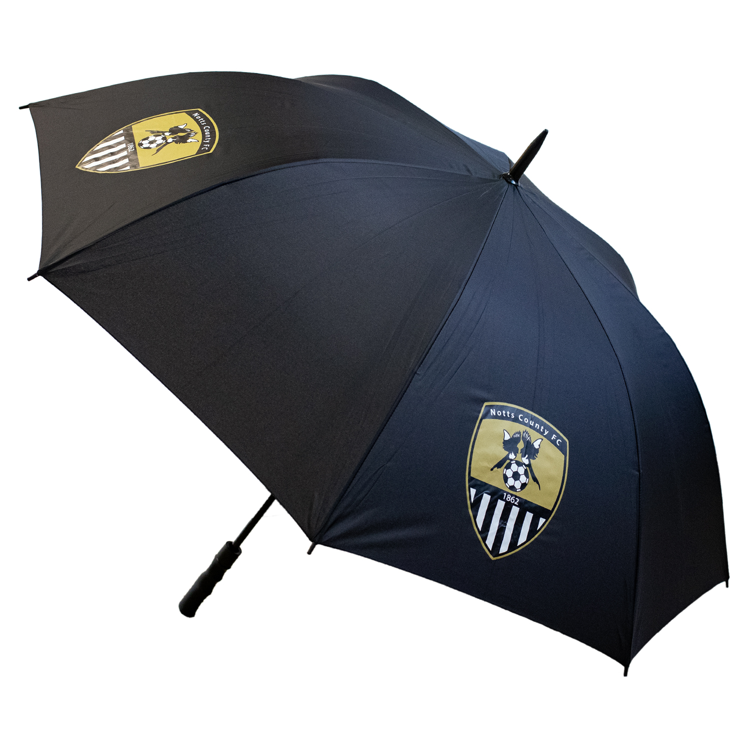 This official Notts County FC umbrella combines a clean black design with the club crest over the sleek black canopy. It features a comfortable pistol-grip handle for better control and a soft-opening mechanism for quick, effortless use. Reliable, durable, and ideal for staying dry on match days or around town.